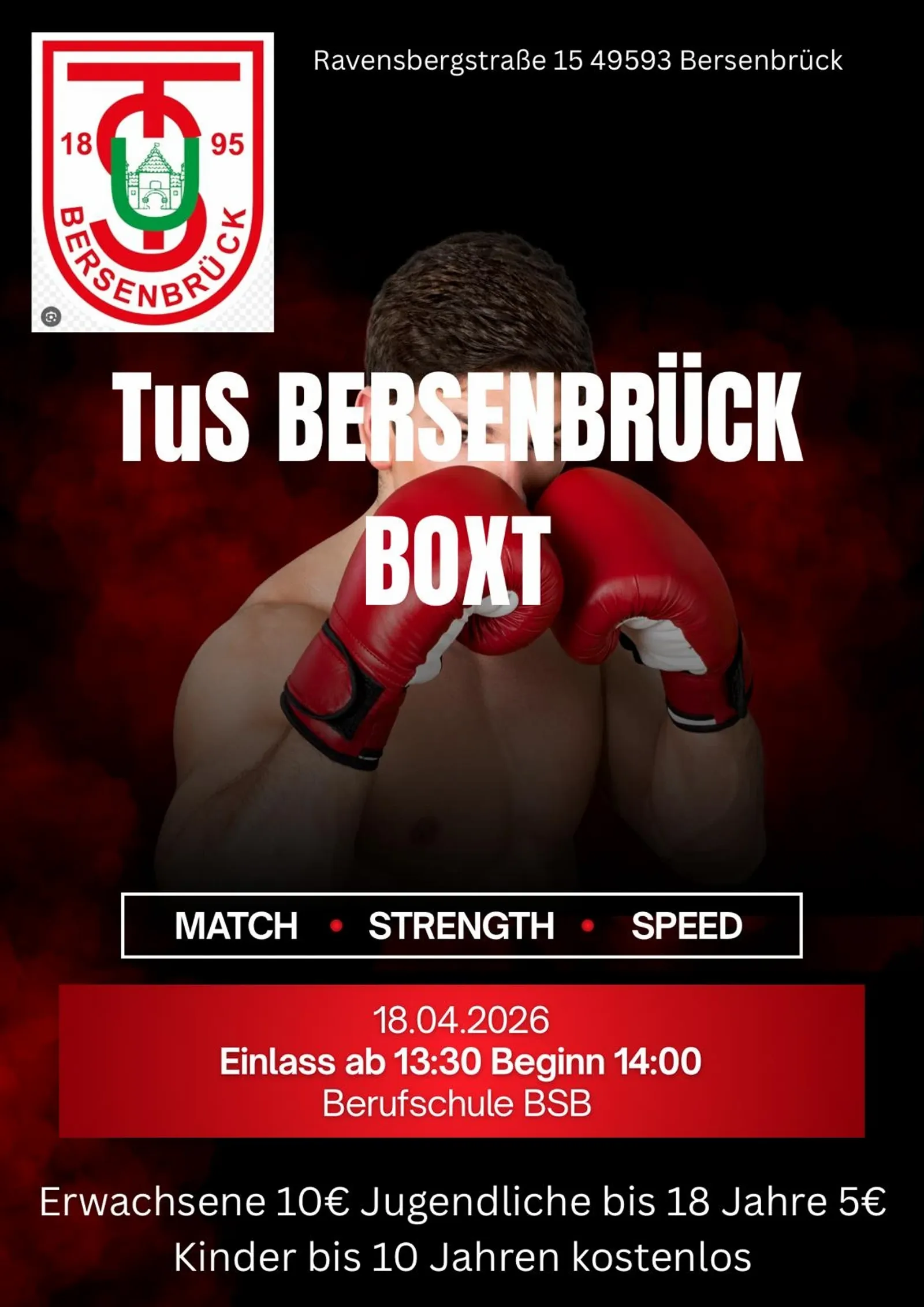Wir freuen uns riesig, euch zu unserer allerersten Boxveranstaltung in Bersenbrück einzuladen! Am 18. April 2026 geht es los, und wir starten um 14 Uhr. Diese Veranstaltung wird ein echtes Highlight für unsere Gemeinde und verspricht jede Menge spannende Kämpfe und eine großartige Atmosphäre. Seid dabei und erlebt die Premiere hautnah!