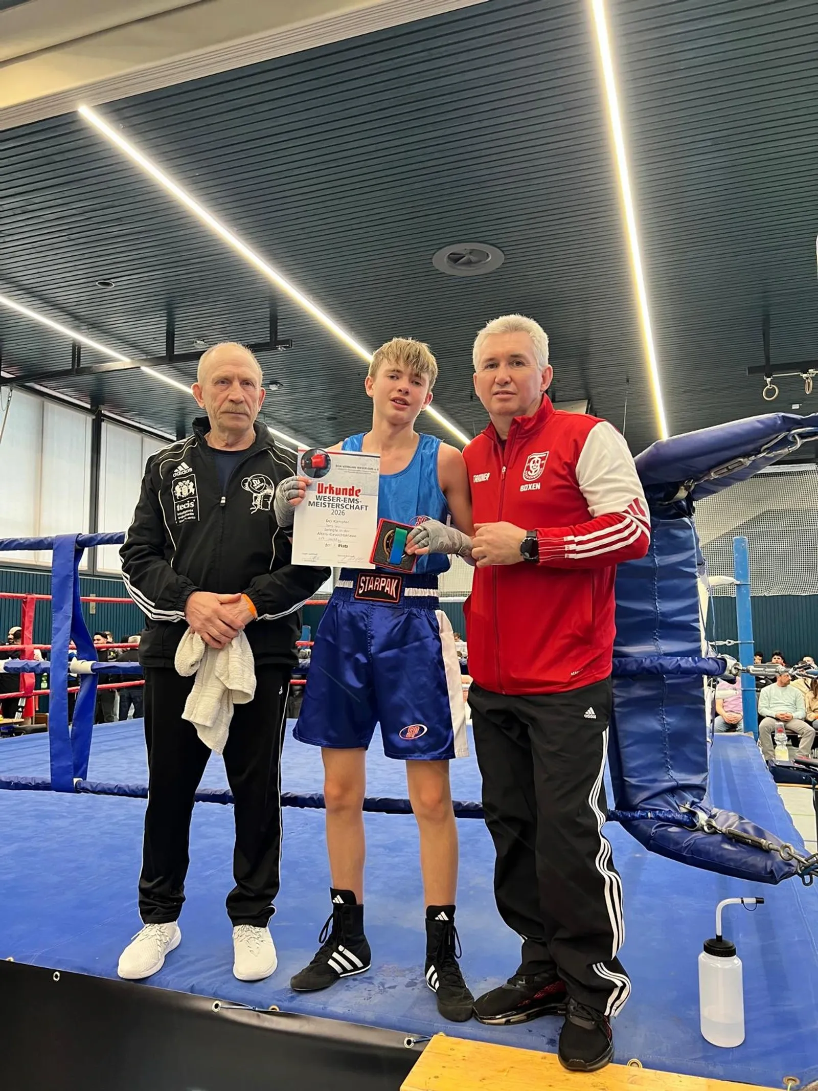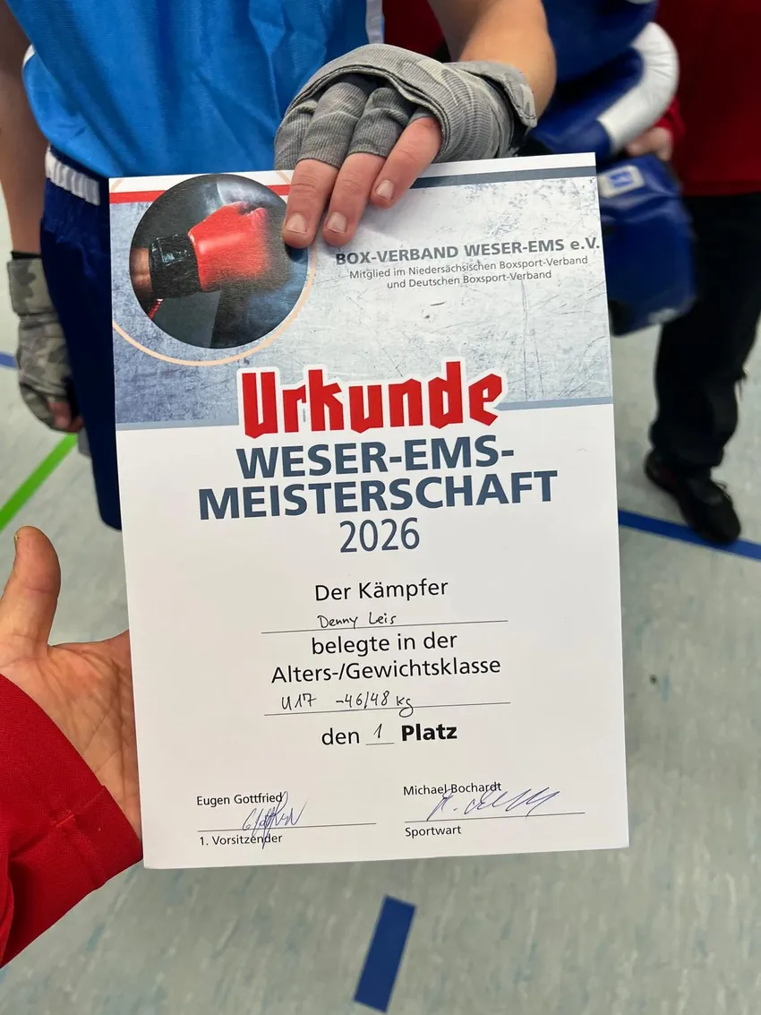 Die Weser-Ems-Meisterschaften sind nun erfolgreich beendet! Besonders stolz sind wir auf unseren Athleten von TuS Bersenbrück Denny Leis, der in der U17, Gewichtsklasse unter 48 Kilo, im Finale gegen Norden angetreten ist und den ersten Platz erringen konnte! Das Finale fand in Cloppenburg statt und war eine riesige Veranstaltung mit insgesamt 26 Kämpfen. Ab nächster Woche geht es dann weiter mit den Niedersachsen-Meisterschaften, bei denen wir mit acht Athleten vertreten sind. Wir hoffen natürlich, dass wir auch dort weiterhin so erfolgreich sein werden!