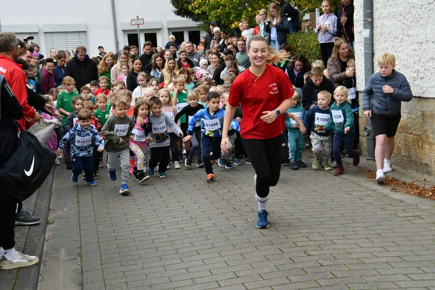Vor dem Hauptlauf über die Kurz- und Langstrecke startete Frank Glose den jüngsten Läufer Nachwuchs. Beim Bambinilauf beteiligten sich sage und schreibe 106 (Vorjahr 111) Kinder, die einen Rundkurs rund um die Schule zu laufen hatten. Hier stand der Spaß am Laufen im Vordergrund und weniger der sportliche Ehrgeiz. Als Lohn gab es eine Medaille für jeden.