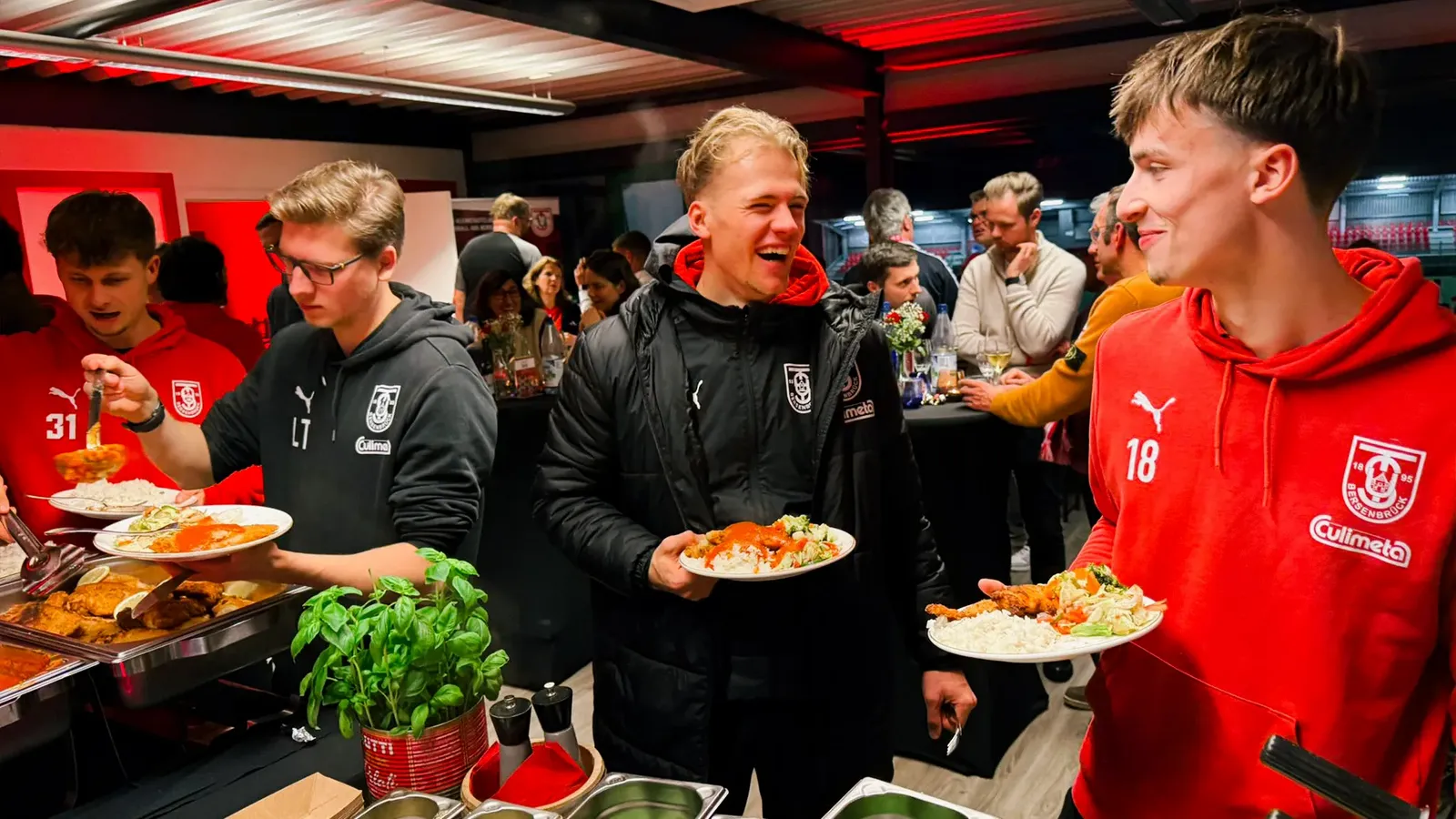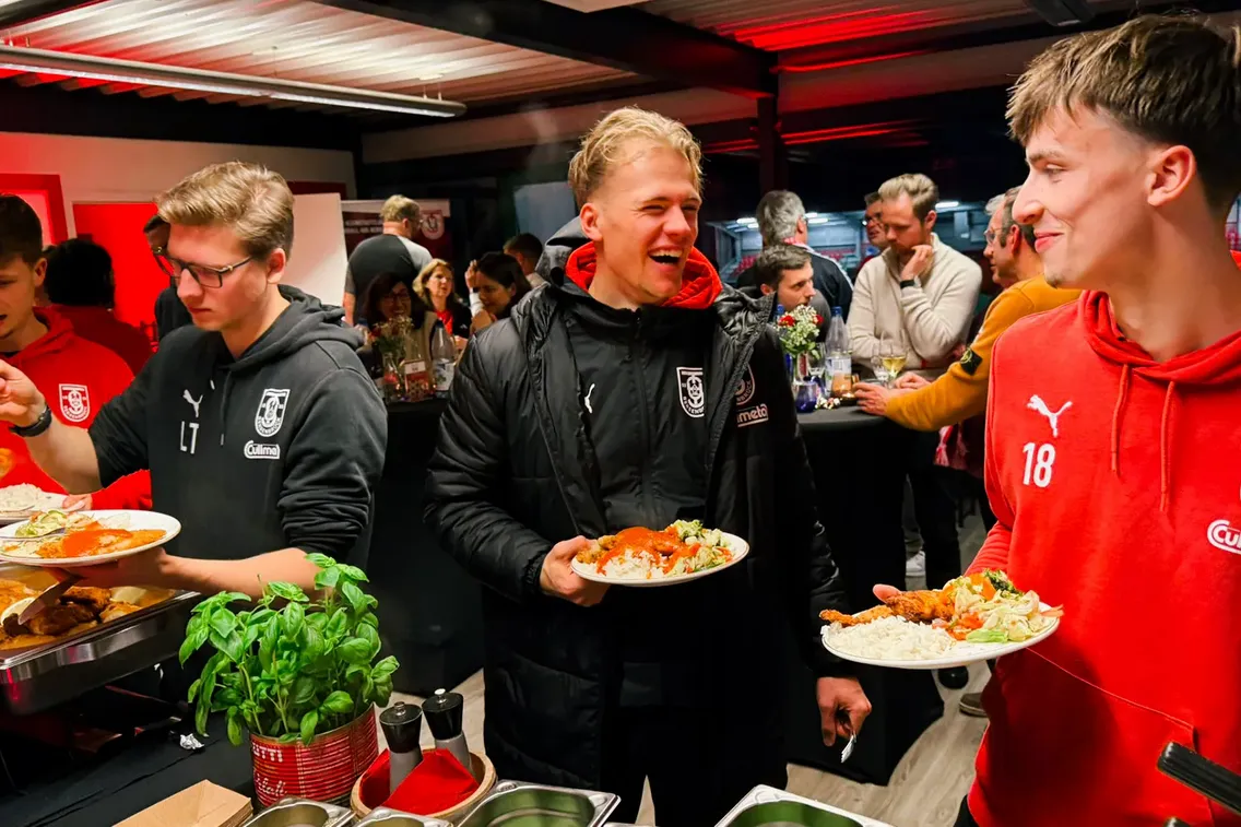 Das winterliche Buffet von Caterer Sancho's EvenTraum wurde selbstverständlich trotzdem serviert, mitsamt eines Käserads für frische Pasta-Kreationen. Während die ersten Speisen und Getränke verzehrt wurden, kristallisierte sich heraus, dass sich die Zusammenkunft der rund 10 Unternehmen aus dem Partnerkreis des TuS Bersenbrück doch optimal für einen spontanen Sponsorenabend eignen würde. Sajo Dzinic, Geschäftsführer von Sancho's EvenTraum, ermöglichte daher eine kurzfristige Nachlieferung der Verpflegung und mit Ankunft der Mannschaft begann ein geselliges Partnerevent, welches eigentlich gar keines sein sollte.